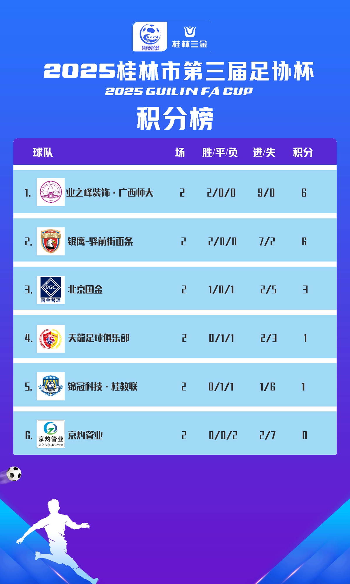 2025桂林市第三届足协杯积分榜(截止6月7日第二轮)