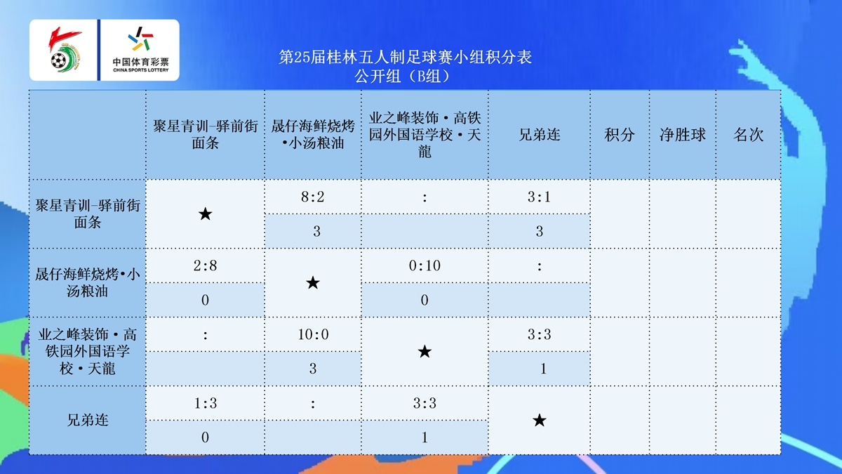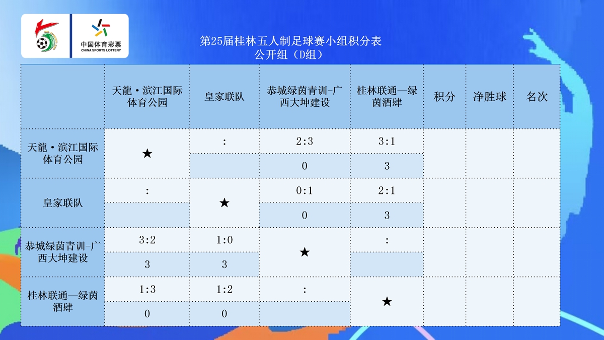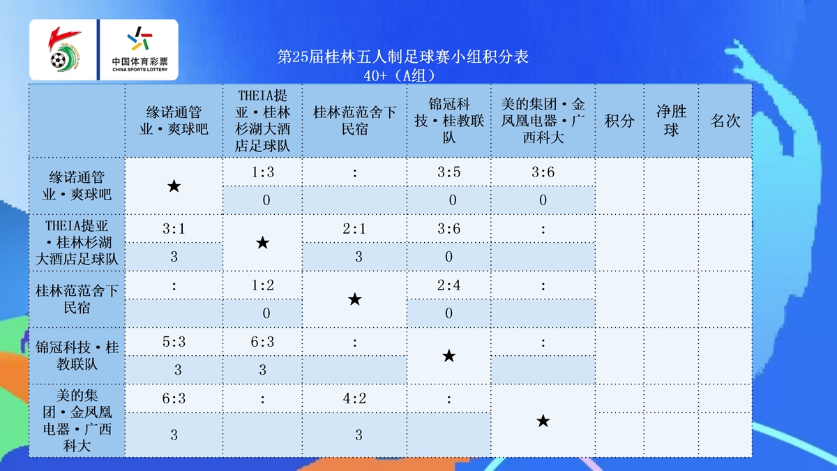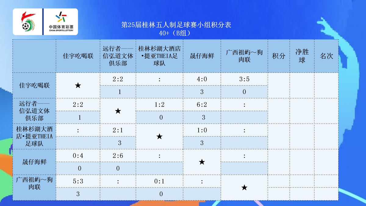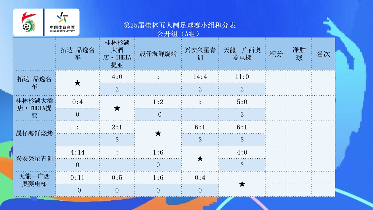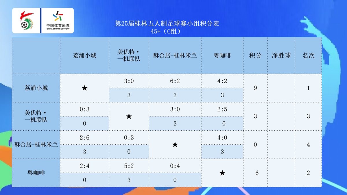 10月23日晚20:30点,第25届桂林五人制足球赛第七比赛日在七星区漓江路甲天下会展中心开战公开组A组和45+组的各支球队展开厮杀。在公开组A组的两场比赛中,拓达-品逸名车4:0完胜桂林杉湖大酒店·THEIA提亚,三战全胜提前晋级,兴安兴星青训同样以4:0的比赛拿下天龍—广西奥菱电梯。在45+A组的比赛中,北京国金2:2战平子兴教育·桂教联队,两队同积7分携手晋级,拓达-品逸名车3:0击败兴安县兴星足球队,拿到一场淘汰赛的门票。在45+B组的比赛中,智喜·日立中央空调·蓝剑2:3不敌乐健,两队分别以第二名和第一名的身份晋级,而桂林桂花5:0大胜国家税务总局桂林市税务局,搭上淘汰赛末班车。在45+C组的比赛中,荔浦小城3:0击败美优特·一机联队,三战全胜拿到小组头名晋级,酥合居-桂林米兰1:10惨败给粤咖啡,后者以小组第二的身份晋级。