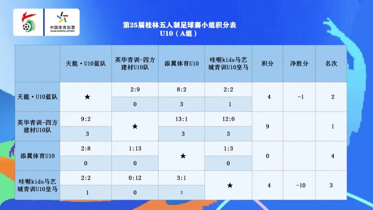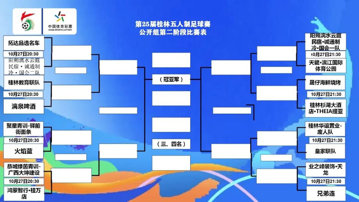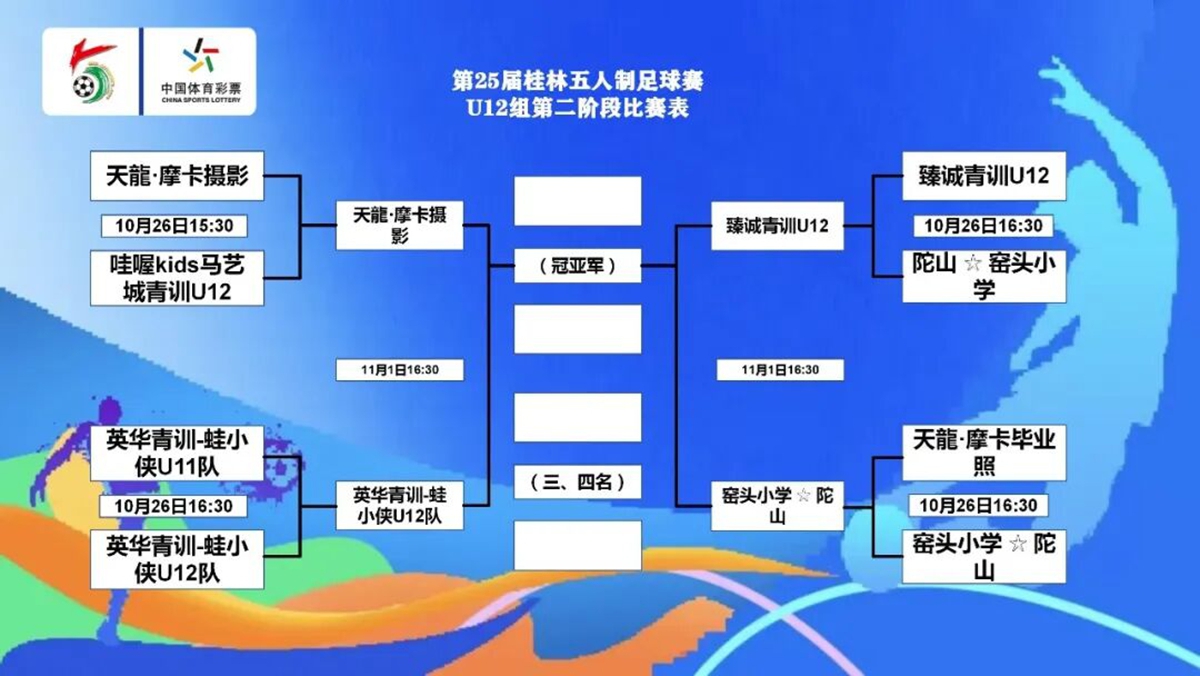 10月26日,桂林五人制进入到了激烈的淘汰赛阶段。 早上的赛事中,初中组进行了小组第四轮的赛事,天龍·红队14:2击败天龍·黄队,4战全胜位居小组第一,天龍·绿队则是以5:1击败广西恭城欣跃青训-老肥眼镜店,两队目前同积9分并列第二。U8组的半决赛中,英华青训-四方建材U8队和广西祖屿·跳绳·中考体育分别击败对手,将在决赛中会师。