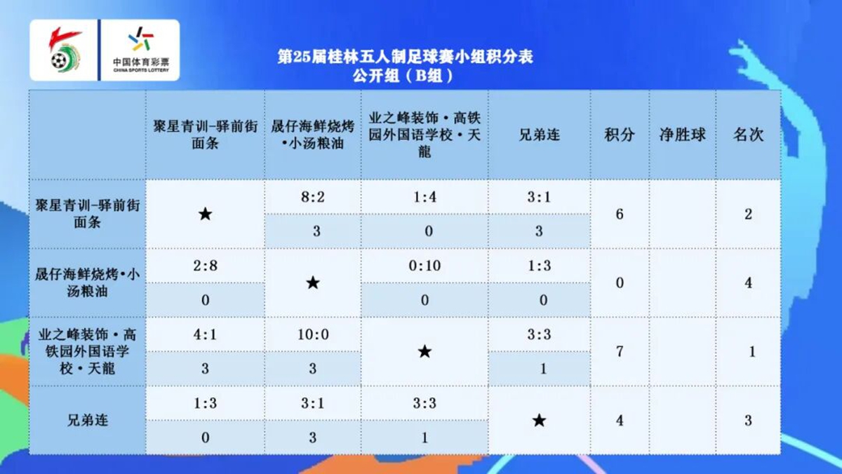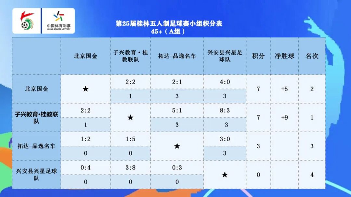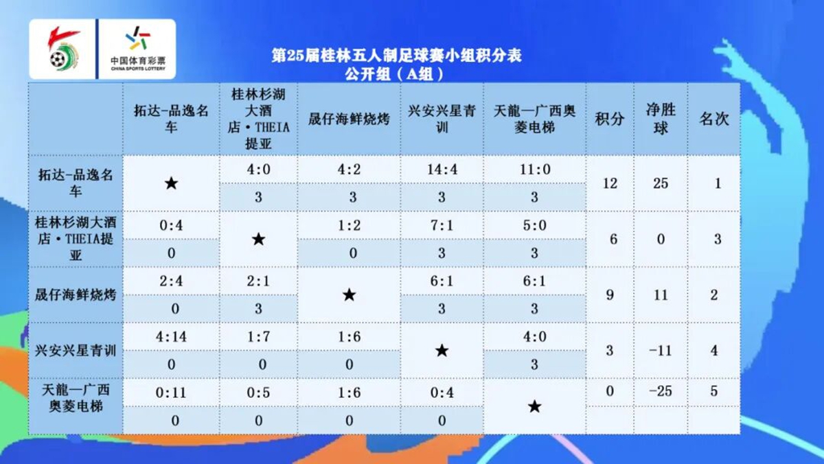 到了晚上,首先进行的是40+组最后一轮的4场比赛。A组中,锦冠科技·桂教联队在已经出线的情况下仍是2:1击败桂林范范舍下民宿+品涵口腔,4战全胜勇夺小组第一。而THEIA提亚·桂林杉湖大酒店足球队与美的集团·金凤凰电器·广西科大1:1握手言和,后者凭借净胜球优势获得小组第二,晋级半决赛。B组中,桂林杉湖大酒店•提亚THEIA足球队4:0轻取晟仔海鲜,3胜1平积10分拿下小组第一,广西祖屿~狗肉联2:1小胜远行者——信弘道文体俱乐部,以9分位居小组第二。