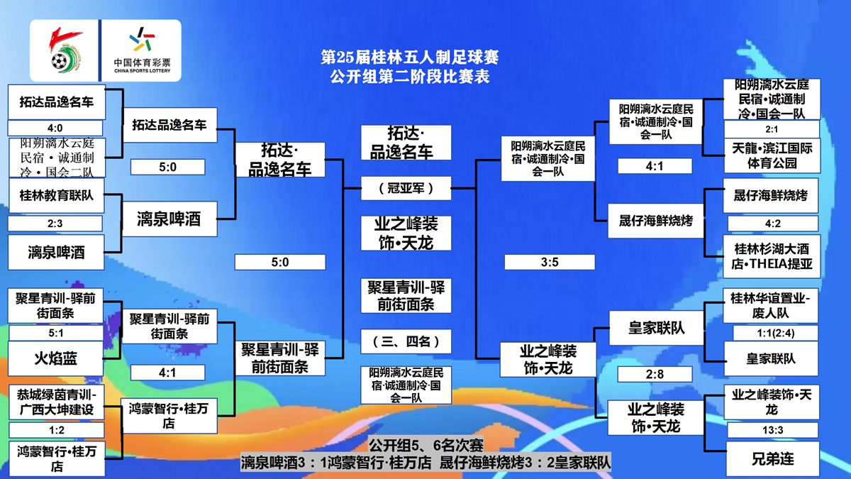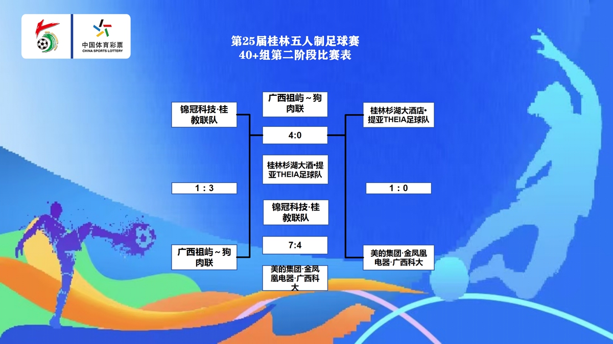 20:30开始的4场比赛,公开组半决赛拓达-品逸名车5:0轻取聚星青训-驿前街面条;公开组5、6名次赛漓泉啤酒3:1鸿蒙智行·桂万店;40+三四名决赛锦冠科技·桂教联队7:4美的集团·金凤凰电器·广西科大;45+三四名决赛乐 健0:2北京国金。